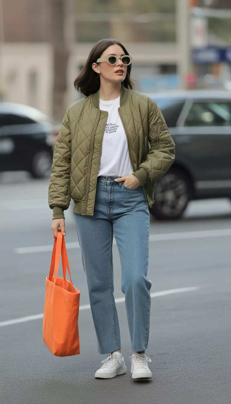 This quilted olive bomber offers the perfect weight for those transitional mornings.
