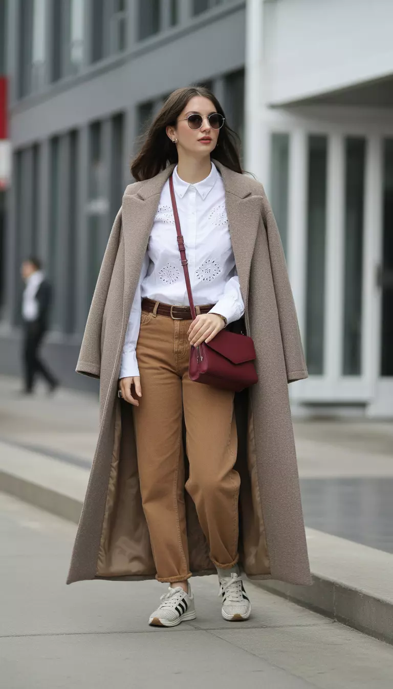 White sneakers keep the entire ensemble grounded, ensuring you stay comfortable through a long day of walking or traveling.