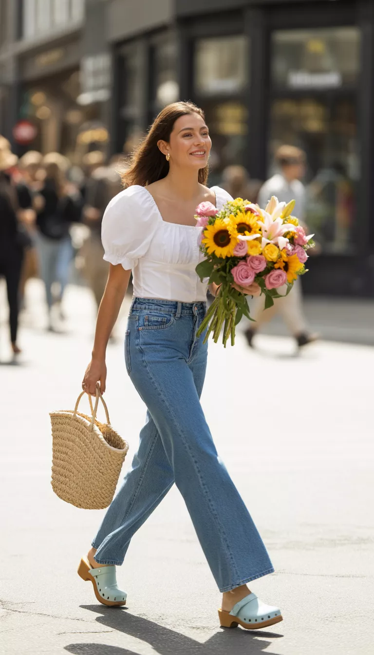 The light blue clogs add a quirky pop of color that proves you do not take fashion too seriously.