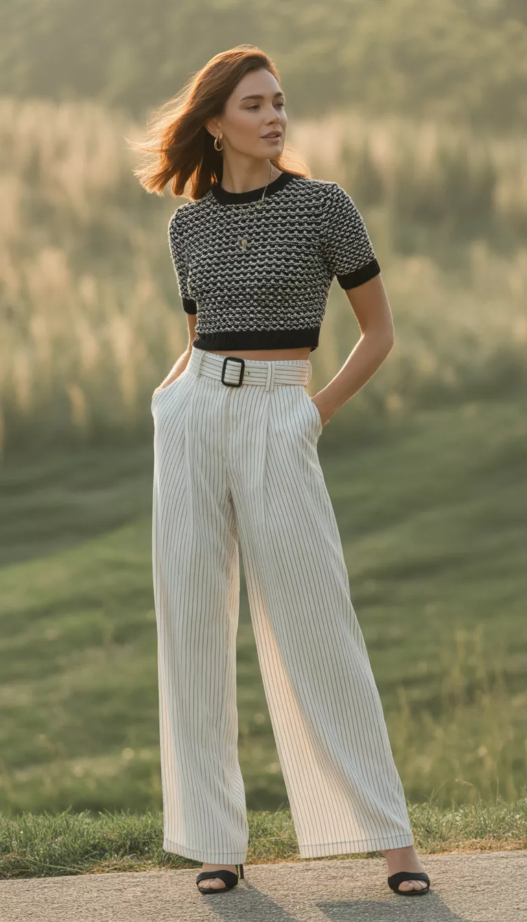 You will find that this black and white patterned knit crop top balances the volume of those high waisted white pinstripe wide leg trousers perfectly.