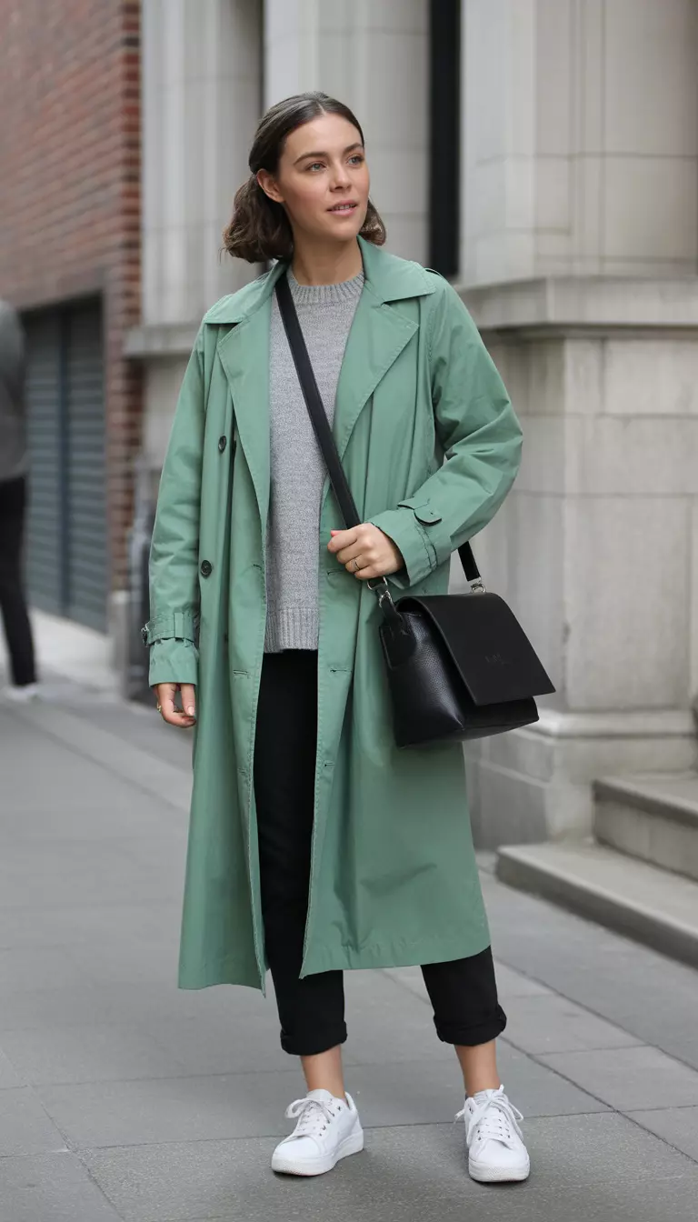 Spring weather often feels like it has a split personality, making a light emerald green trench coat your best friend.