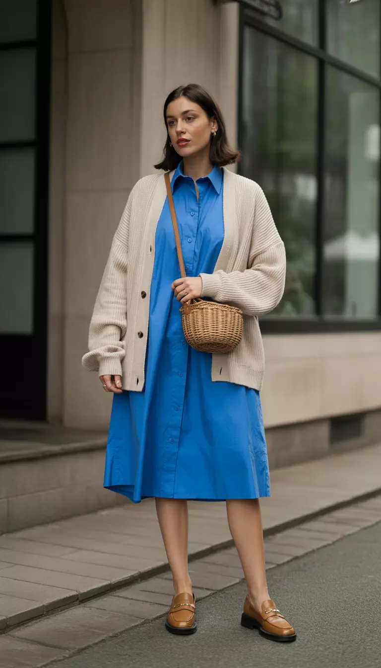 A crisp cerulean blue shirtdress provides a structured base that works for both brunch and the office.