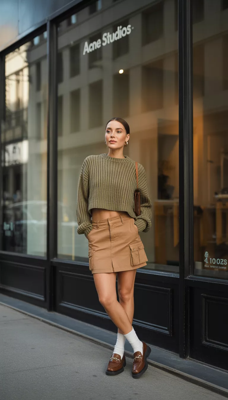 This olive ladder knit sweater breathes perfectly during those sticky July afternoons, while the cargo skirt adds a touch of tactical utility for navigating the subway.