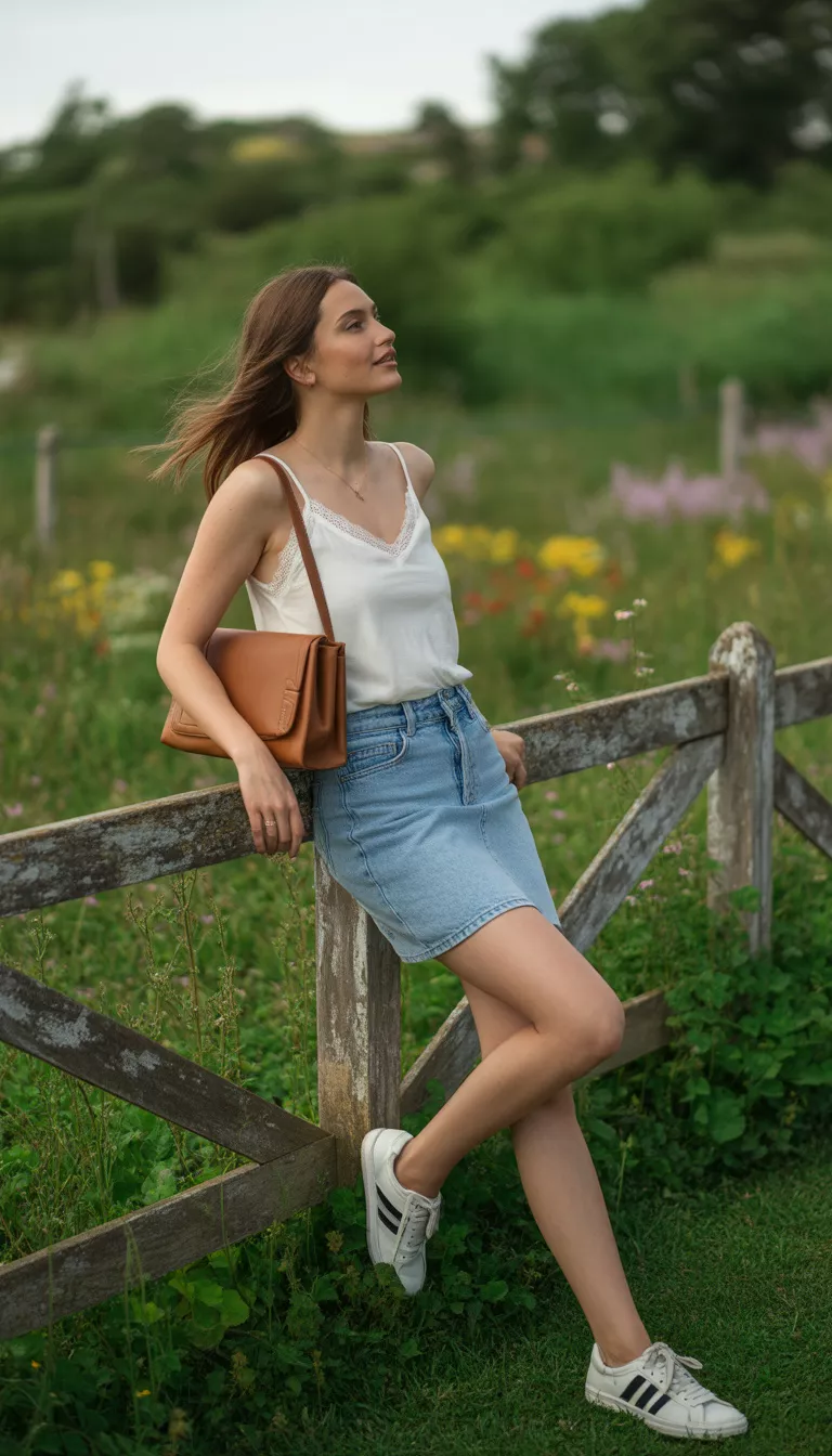 Pairing it with a denim mini skirt keeps the vibe youthful and ready for a weekend farmers market trip.