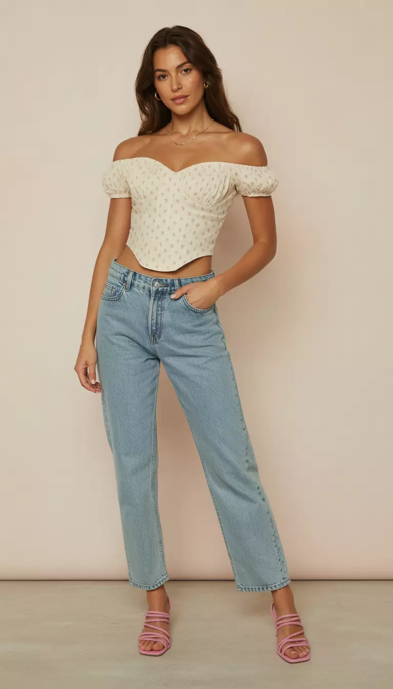 A white knit cropped sweater paired with light blue high-waisted jeans feels fresh and youthful.