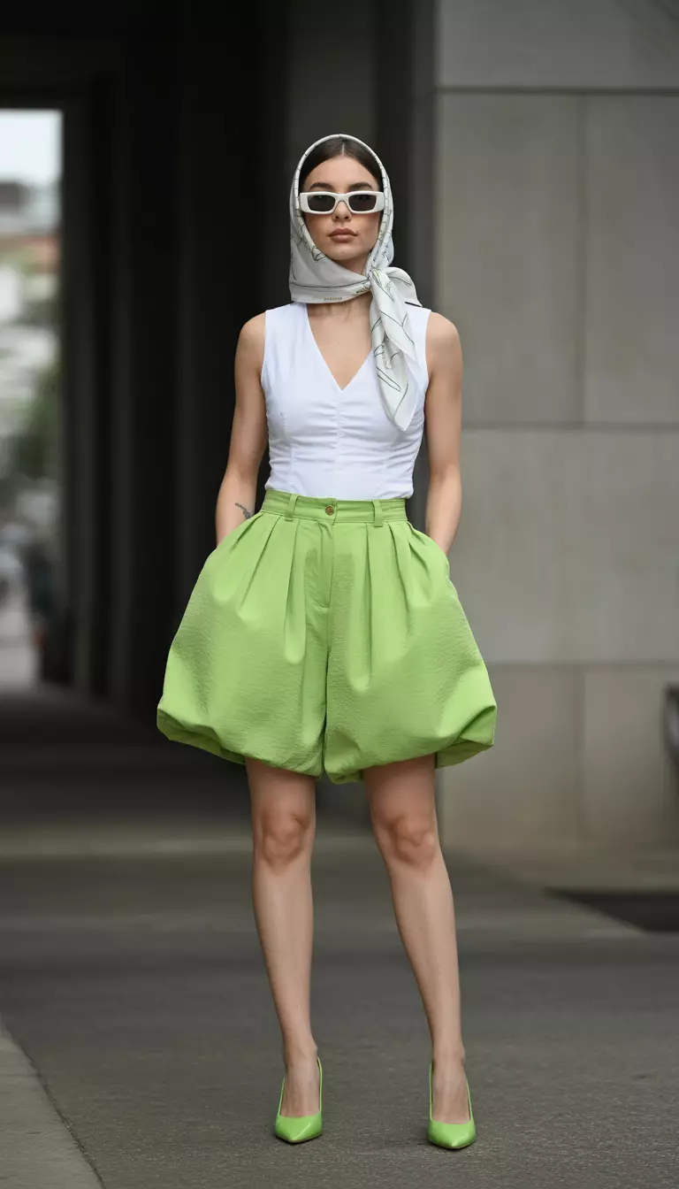 The voluminous lime green shorts provide a playful pop against a crisp white top and matching scarf.