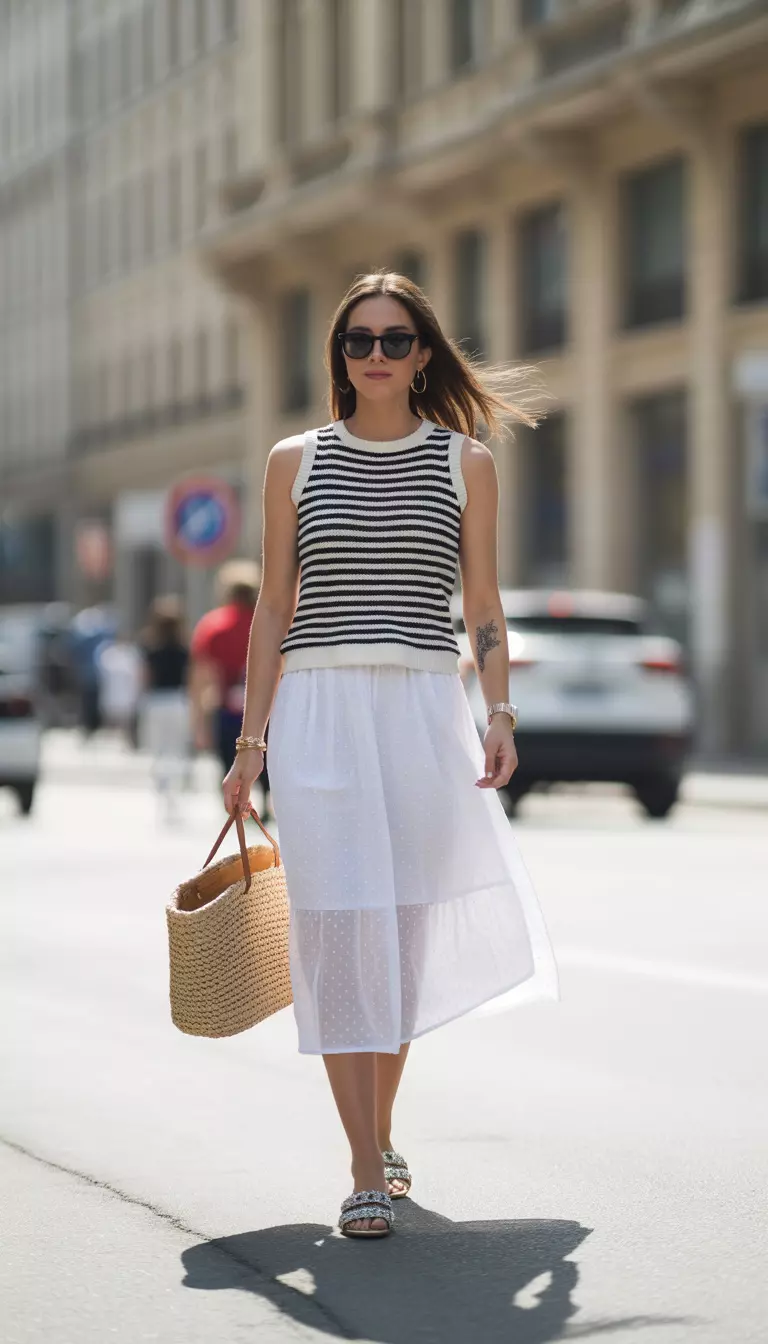 You can achieve this crisp look by tucking a sleeveless knit top into a breezy white midi skirt.