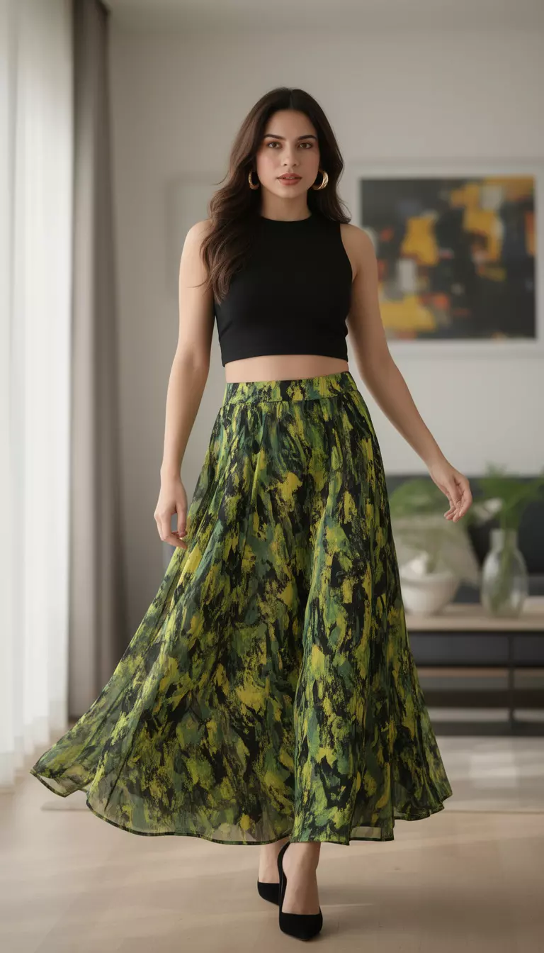 By keeping the top simple with a black sleeveless crop top, you ensure the skirt remains the star of the show.