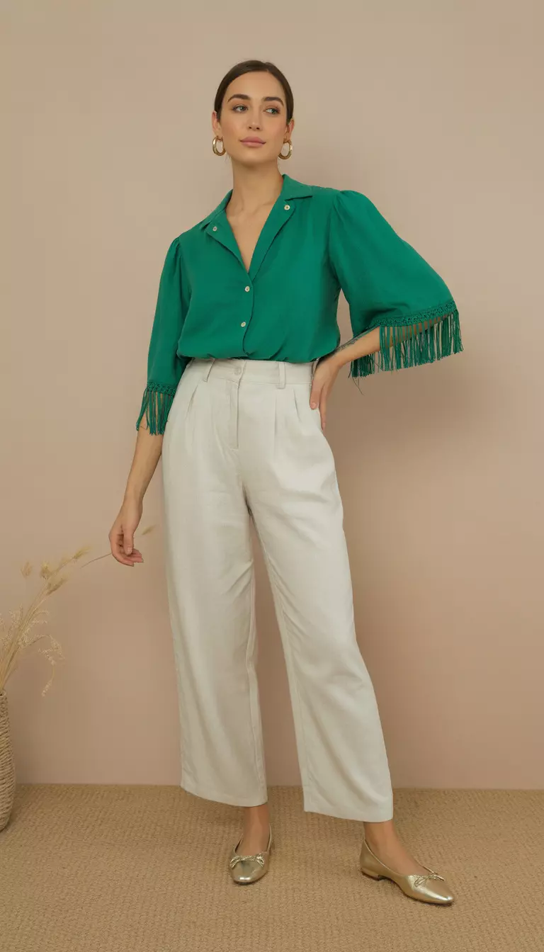 This emerald green blouse creates a playful vibe while the high waisted white linen pants keep the overall aesthetic clean.