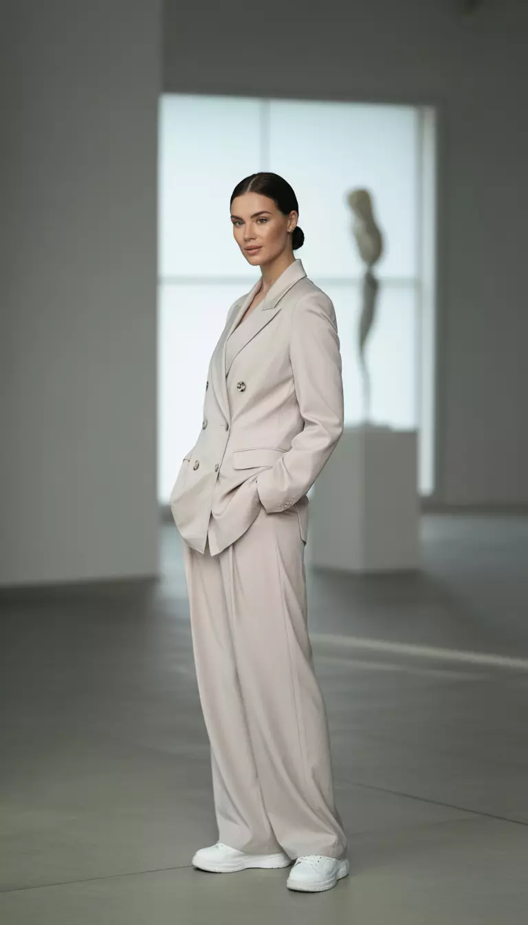 This pale beige double breasted suit offers a relaxed silhouette that refuses to feel stiff or corporate.