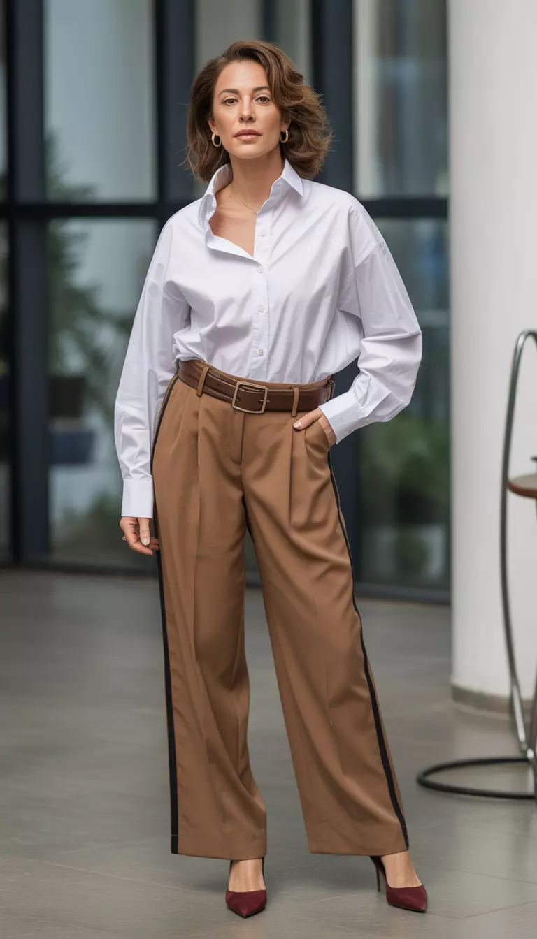 Tucking a white blouse into high waisted taupe trousers creates a defined waistline that celebrates your figure.