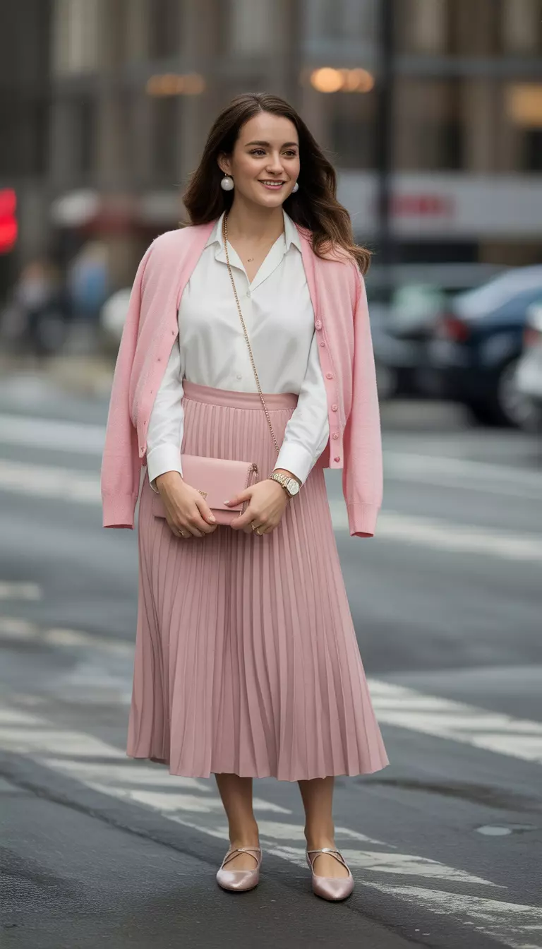 A blush pink cardigan over a cloud white sheath dress creates a soft, polished image.