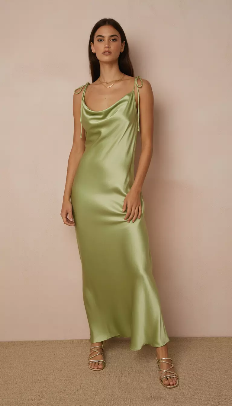 This light green maxi dress features blouson sleeves that add an air of mystery and romance.