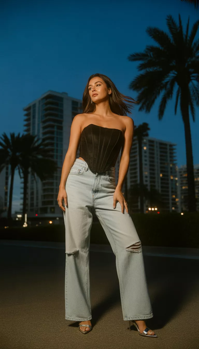 The contrast between a structured corset and baggy, ripped jeans serves as the ultimate high low fashion statement.