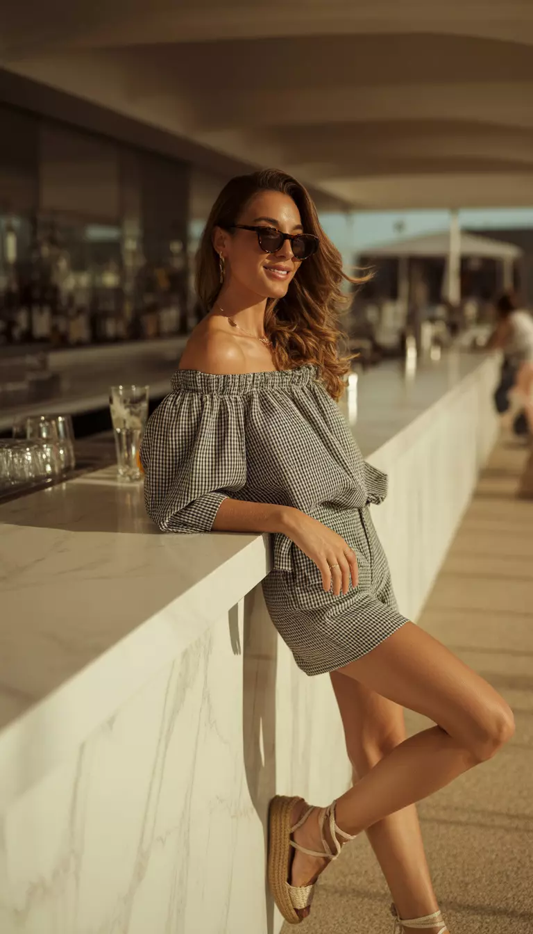 This outfit transitions seamlessly from an indoor setting to a seaside terrace.