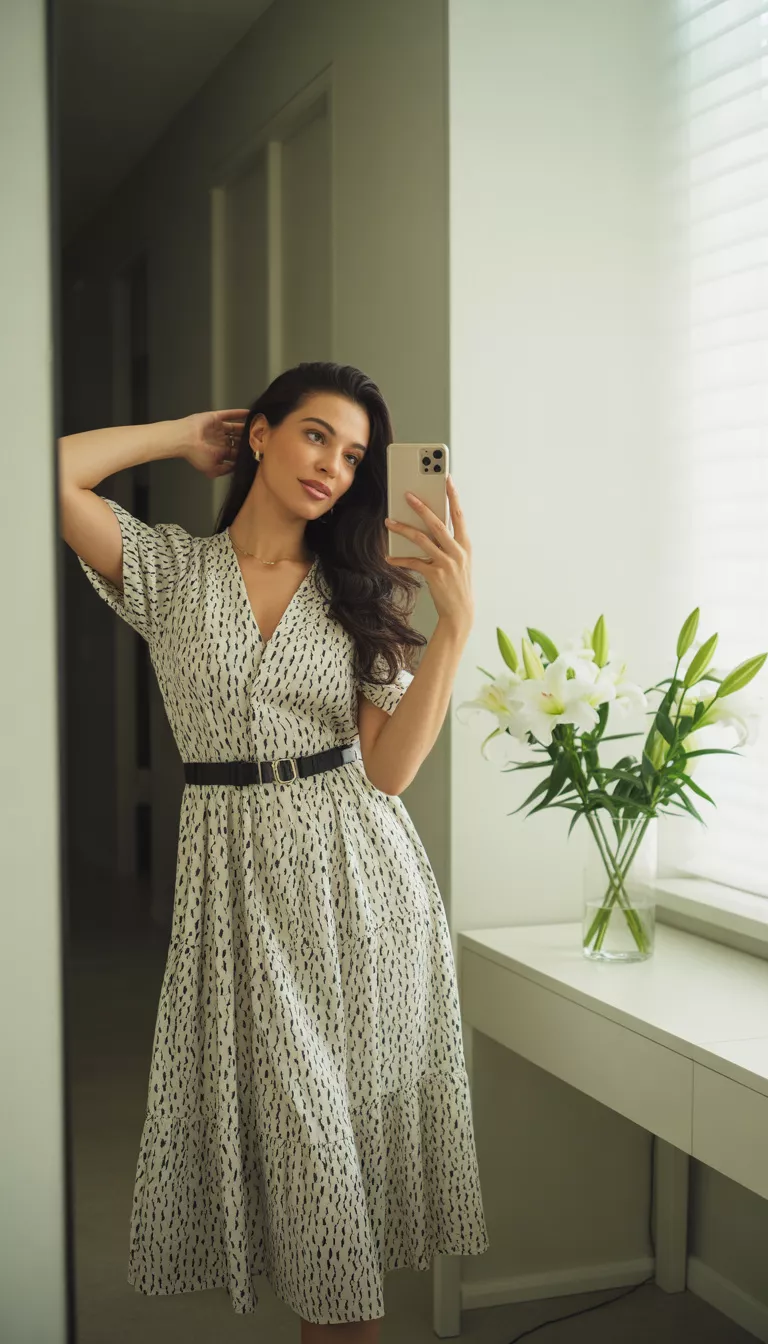 A colorful floral midi dress acts as a cheerful statement piece that brightens up the room.