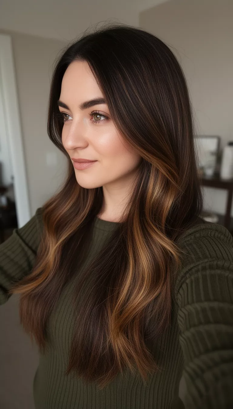 Golden highlights around the face add a touch of luxury and warmth to long, voluminous dark brown hair.