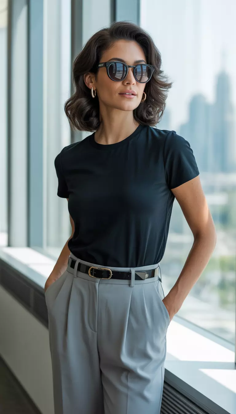 A simple black belt defines the waist and adds a professional touch to the t-shirt.