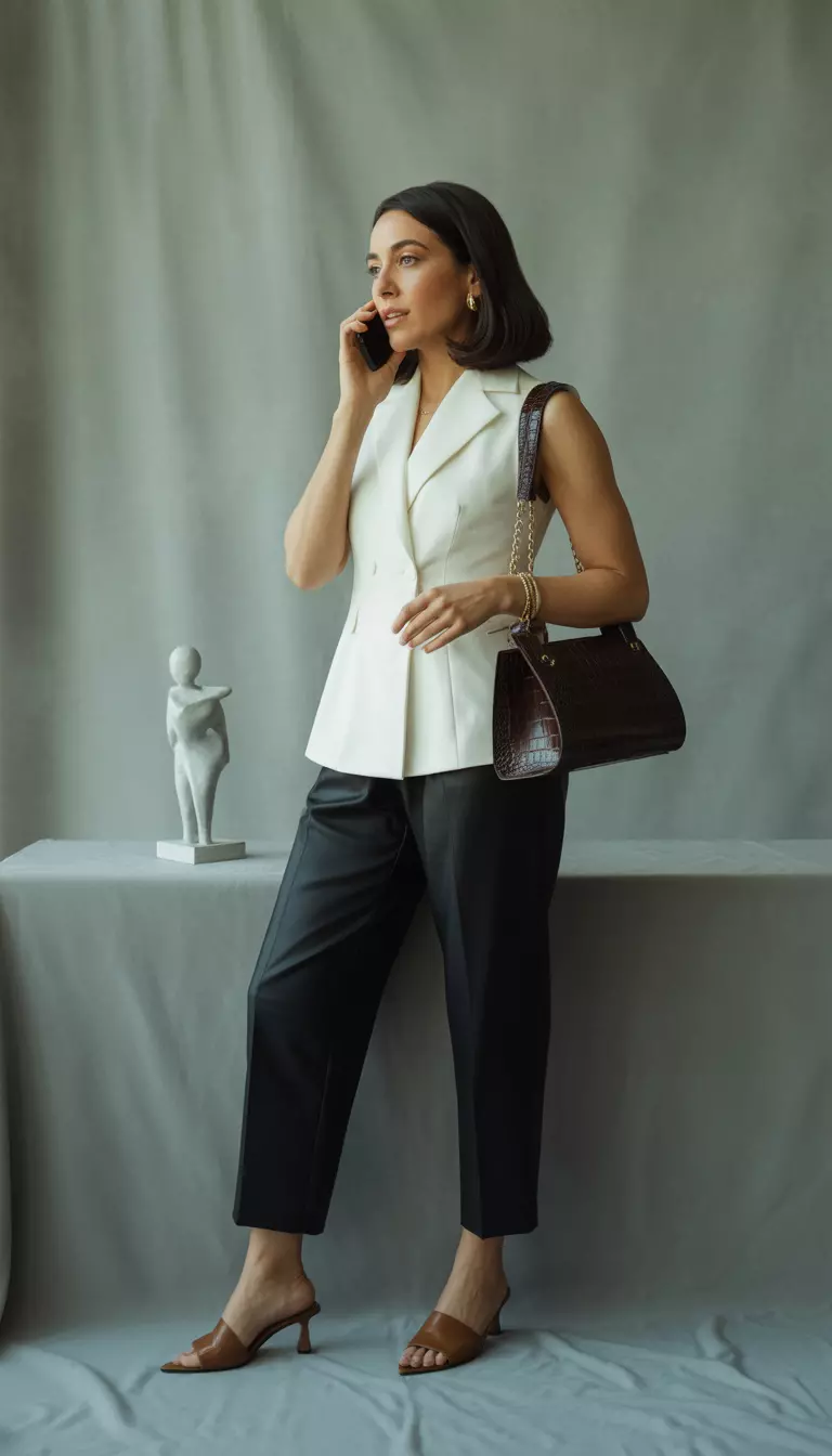 Adding a sleeveless white structured vest provides that hit of professional polish needed for an office environment.
