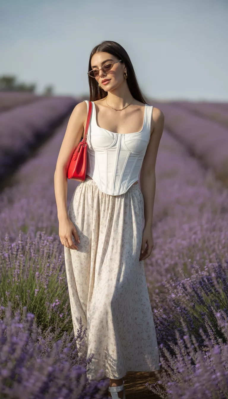 Pairing it with a voluminous white tiered maxi skirt creates a classic Mediterranean aesthetic.
