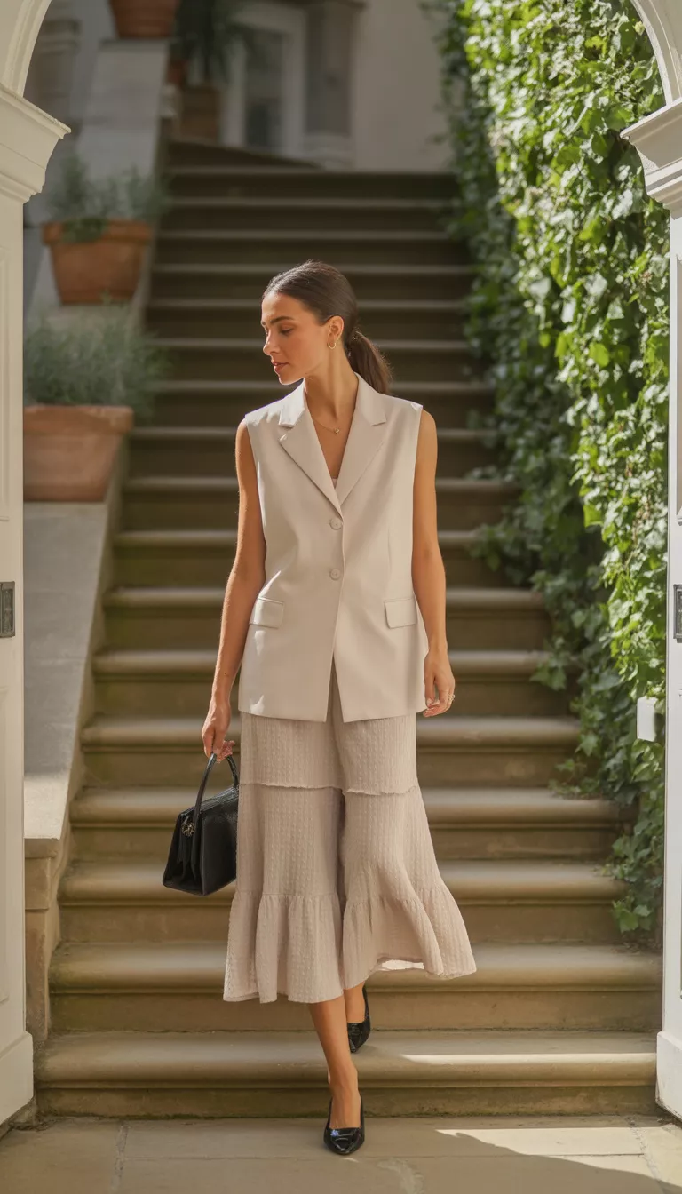 When you pair a tailored sleeveless vest with an off white ruffled skirt, you achieve a level of sophistication that makes people assume you own a vineyard.