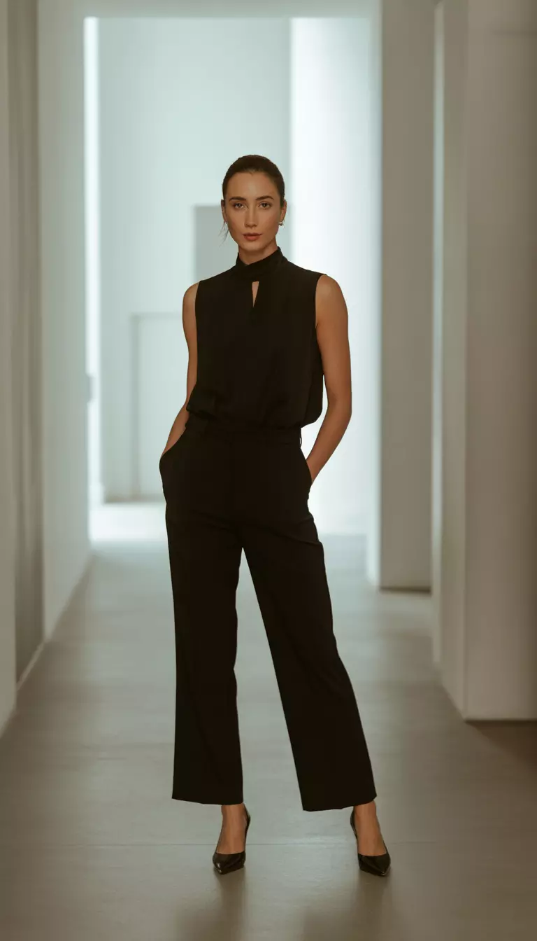 Try a fitted black sleeveless top paired with crisp white wide-leg trousers for a timeless look.