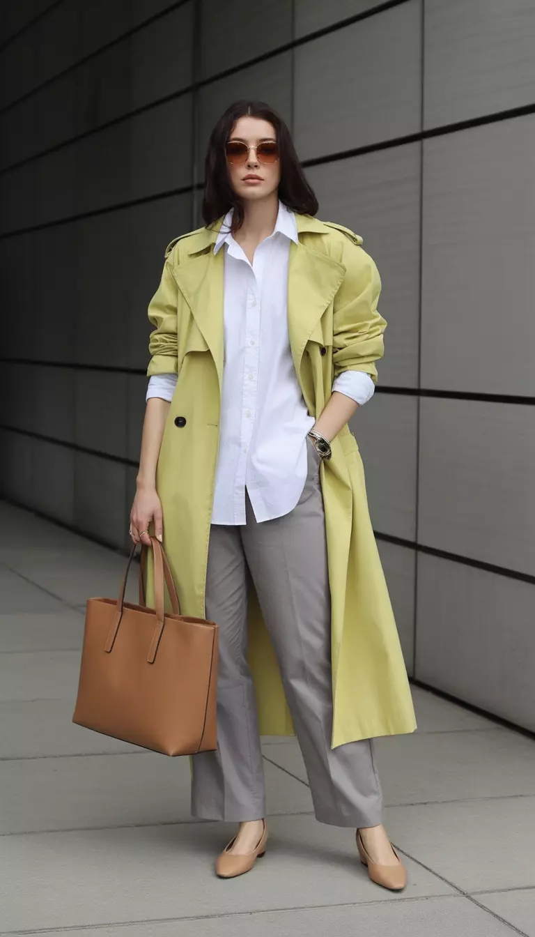 This look pairs a bold sunshine trench with calm summer grey trousers to keep you grounded while your outerwear does the heavy lifting.