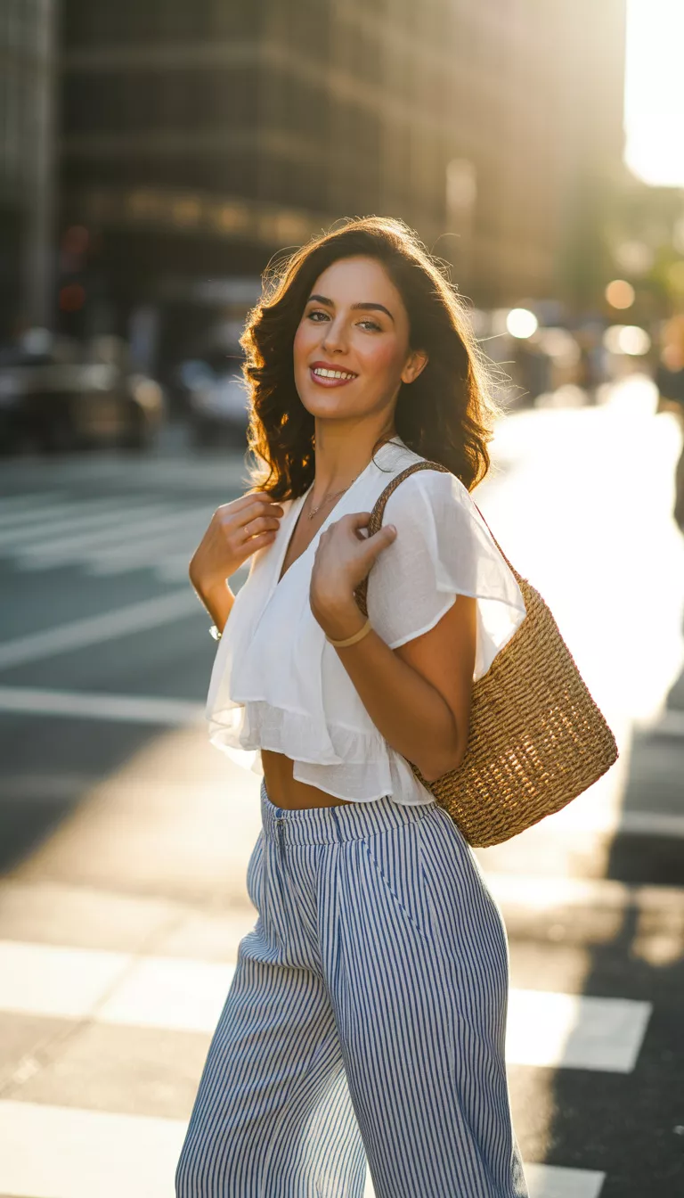 These wide leg pants keep the air flowing, while the white ruffled crop top adds a touch of feminine flair.